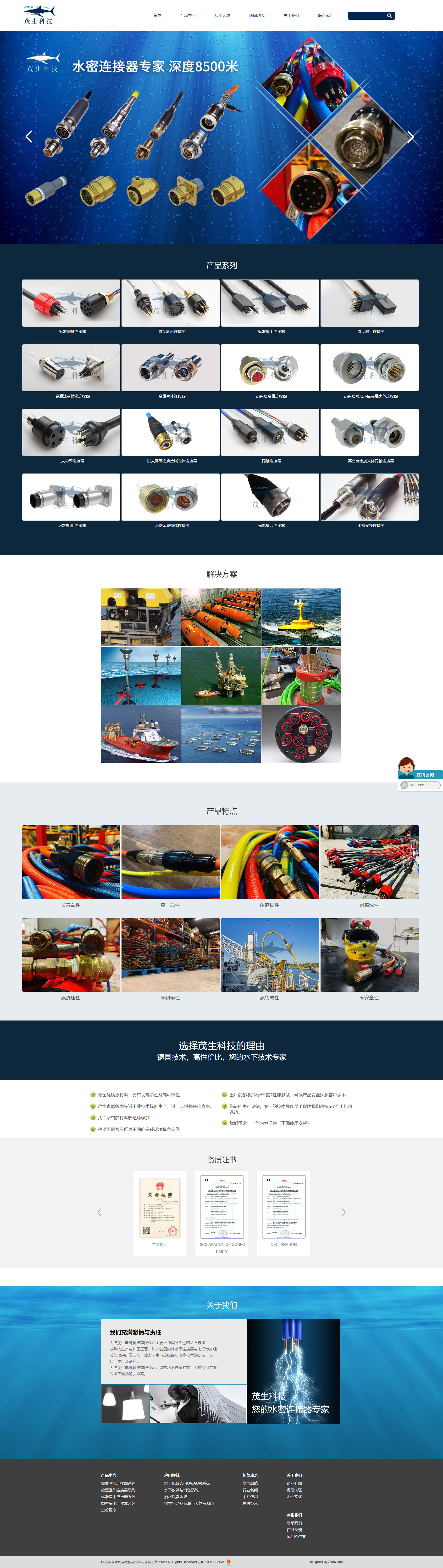 大连茂生电缆科技有限公司是一家水下技术解决方案的供应商,专注于为客户提供及解决水下技术方案,致力于为世界各地的海洋科学工程部门、海上油气运营商,水下机器人公司,潜水设备制造商、海洋通信设备制造商、军事工业以及大学各实验室等提供各种先进的产品和系统解决方案。