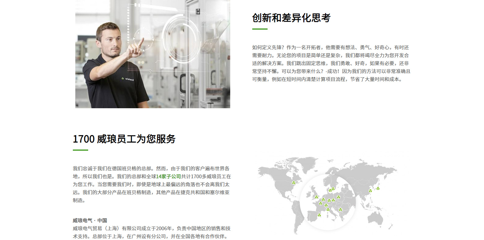 威琅电气成立于1910年,作为一家具有百年历史的德国企业,威琅电气为客户和合作伙伴提供信号和电力传输及分配的解决方案,评估和方案革新。 简单,快速是产品开发的核心理念。威琅电气在70多个地区设有分公司和销售代表处,2014年拥有2000位员工。