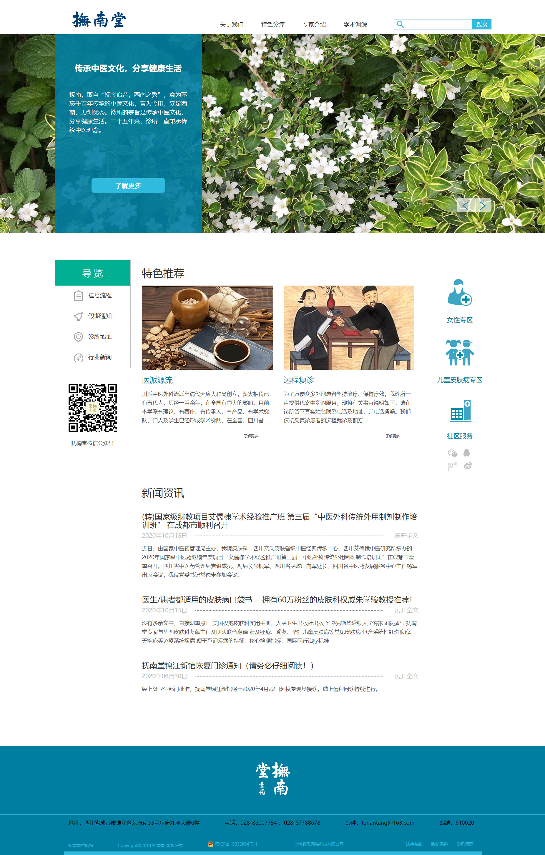 抚南诊所成立于1993年,由中医外科、皮肤科医生、四川省十大名中医之一的艾儒棣教授主持。抚南,取自“抚今追昔,西南之秀”,意为不忘千百年传承的中医文化,昔为今用,立足西南。诊所的宗旨是传承中医文化,分享健康生活。二十五年来,诊所一直秉承传统中医理念,辨证施治、药材道地、悉心服务,尽力为每一位求医者缓解病苦,在老百姓中有较好的信誉和口碑。
