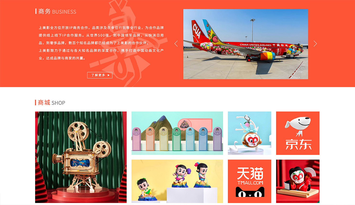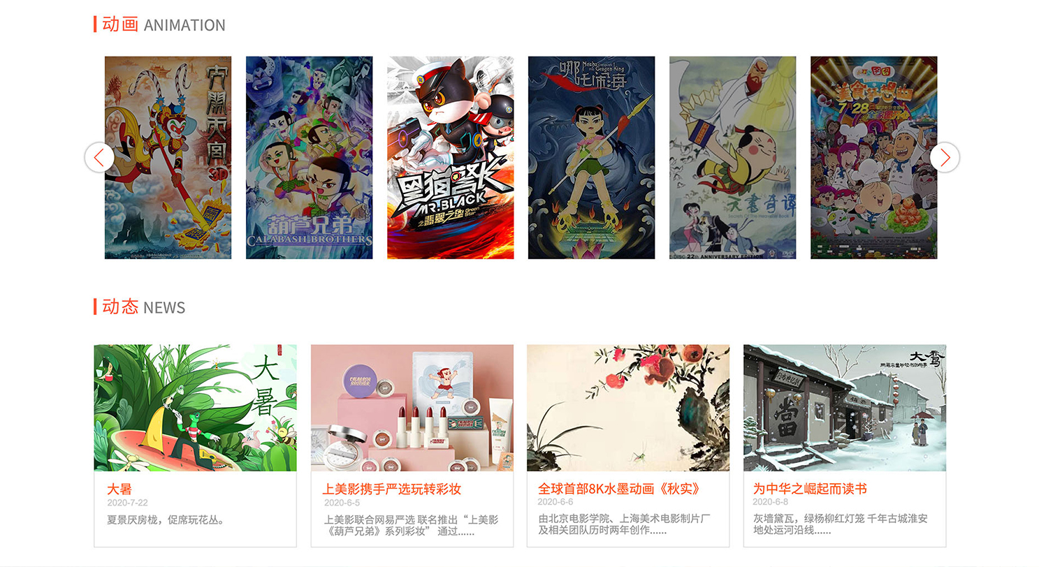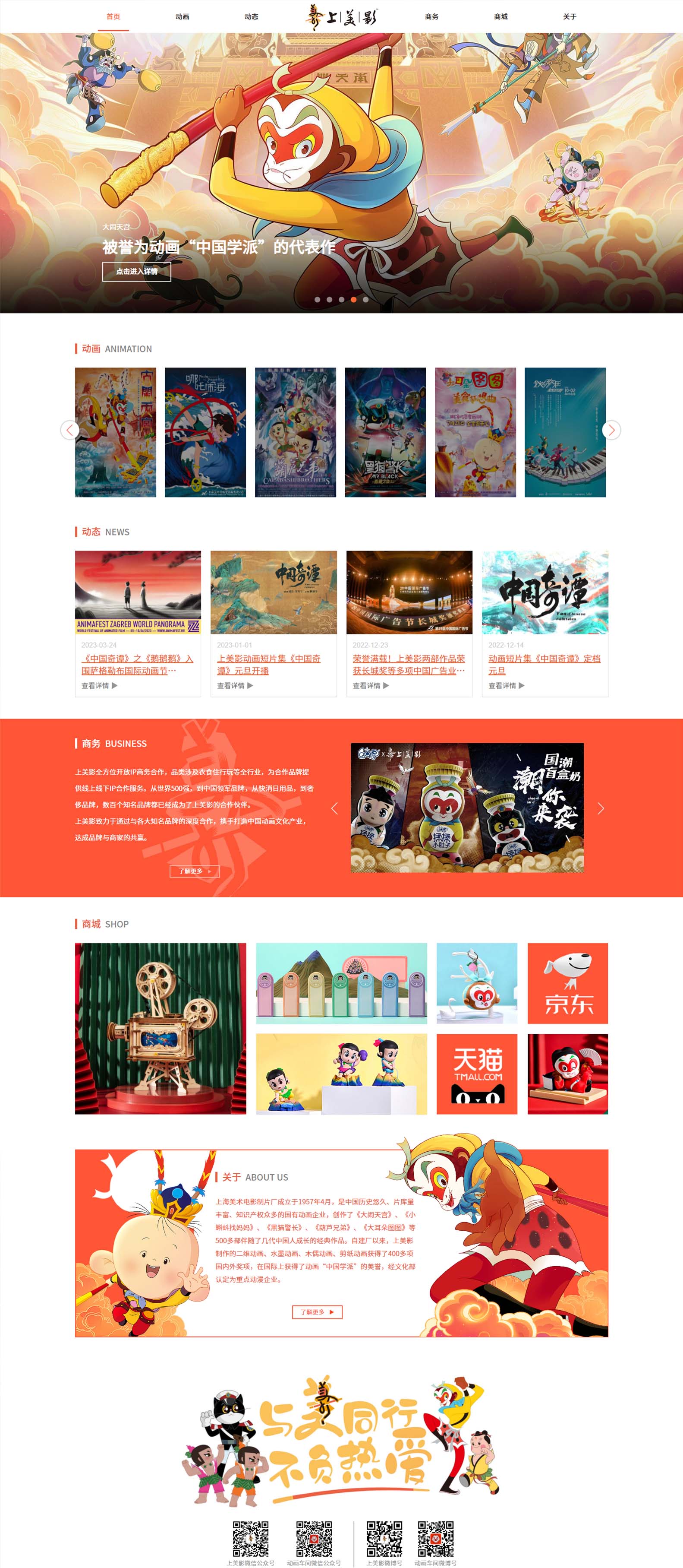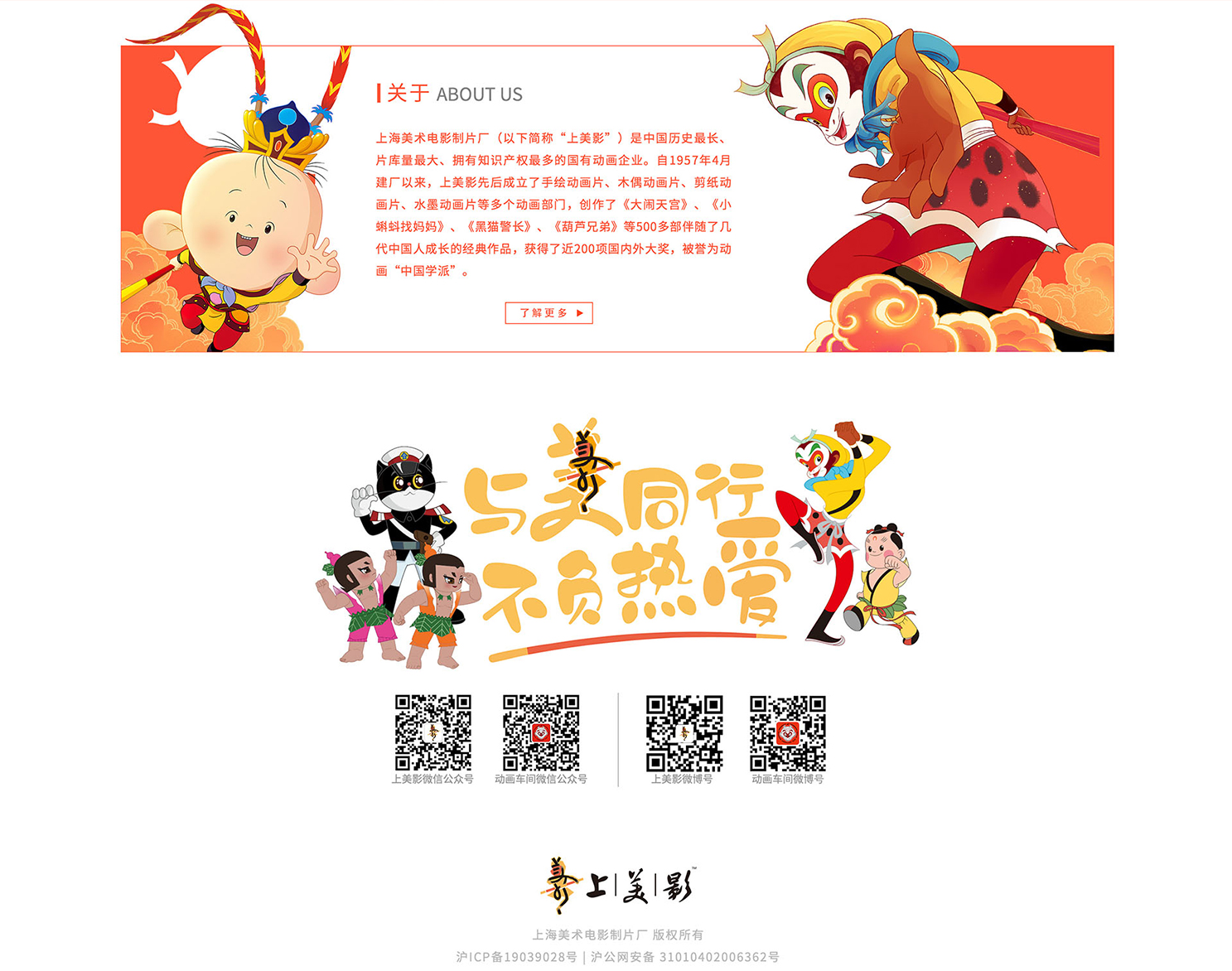 上海美术电影制片厂(以下简称“上美影厂 [1] ”)是历史、片库量、拥有知识产权较多的国有动画企业。前身是东北电影制片厂卡通股,1949年成立美术片组,次年迁到上海。 自1957年4月建厂以来,上美影先后成立了手绘动画片、木偶动画片、剪纸动画片、水墨动画片等多个动画部门,创作了《大闹天宫》、《小蝌蚪找妈妈》、《黑猫警长》、《葫芦兄弟》等500多部伴随了几代中国人成长的经典作品,获得了近200项国内外大奖,以动画“学派”享誉国际。2020年9月,是涵智团队在设计项目中,一个提升的重要日子,凭借专业的服务能力,与上海美术电影制片厂携手建设官网,让我们小时候的经典印象再次重现。