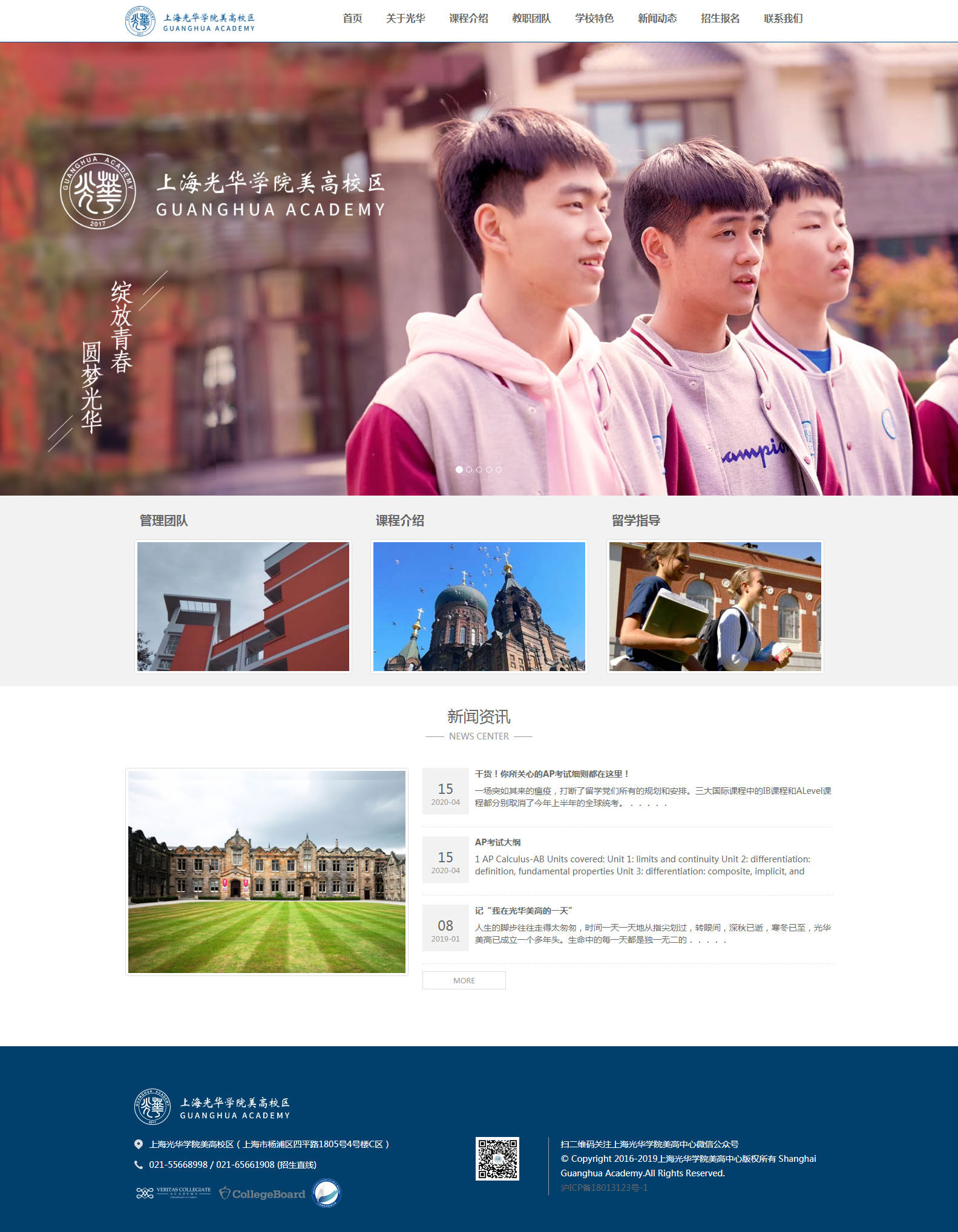 上海光华学院美高校区(简称光华美高)成立于2017年11月,原名上海光华学院杨浦校区(光华杨浦),隶属于光华教育集团,系光华教育集团整合优质教学资源与师资队伍,着力打造从事AP课程教学的高中,并于2018年9月获美国大学理事会授权(编号694095)正式成为受美国大学理事会认可的AP学校。学校位于上海市虹口区东体育会路390号,毗邻上海外国语大学,环境幽雅,人文教育气息浓厚,交通便捷,共享上外现代化教学楼、综合楼、行政办公楼、学生公寓楼、操场、食堂等设施。