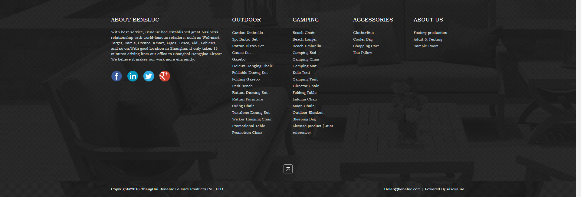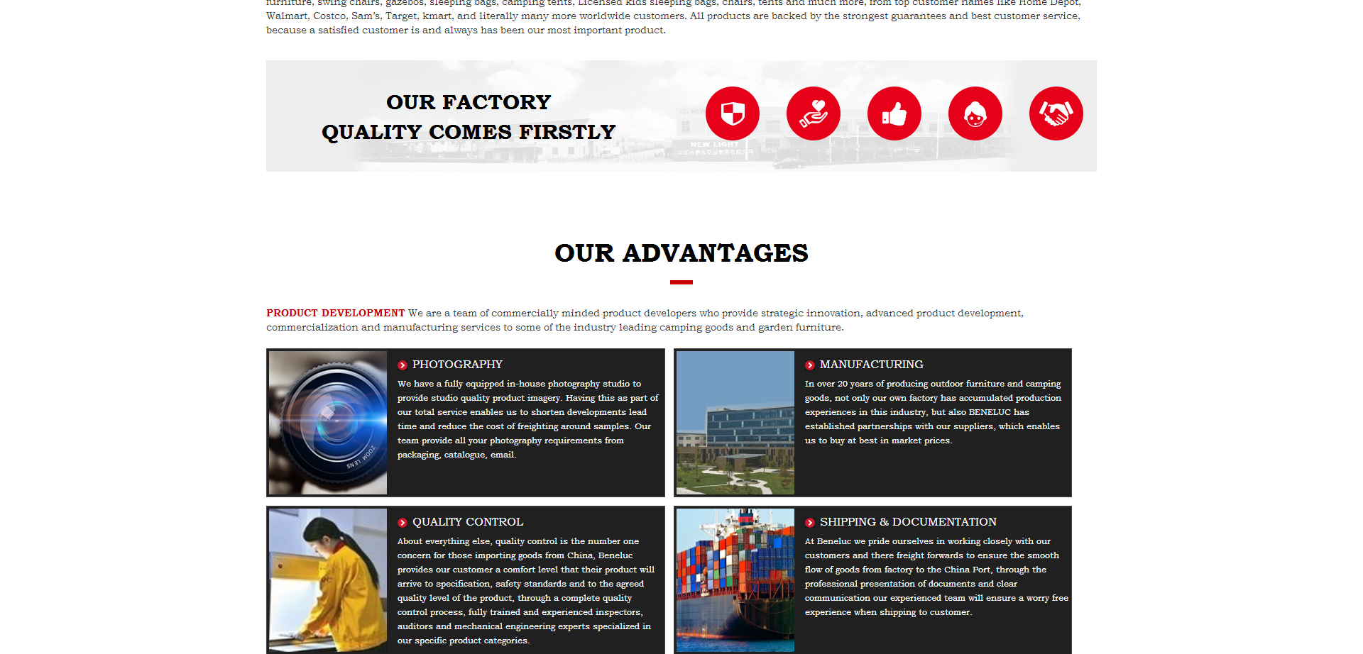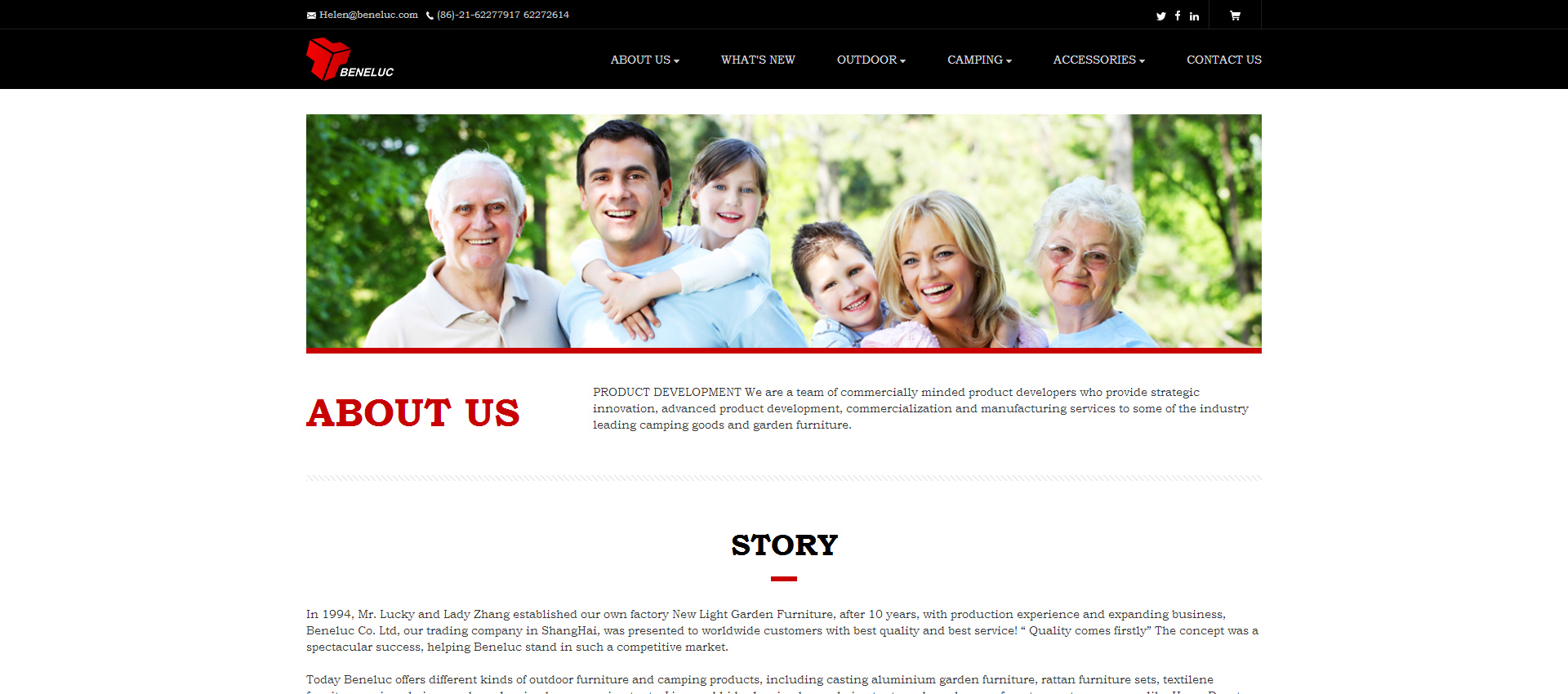 In 1994, Mr. Lucky and Lady Zhang established our own factory New Light Garden Furniture, after 10 years, with production experience and expanding business, Beneluc Co. Ltd, our trading company in ShangHai, was presented to worldwide customers with best quality and best service! “ Quality comes firstly” The concept was a spectacular success, helping Beneluc stand in such a competitive market.