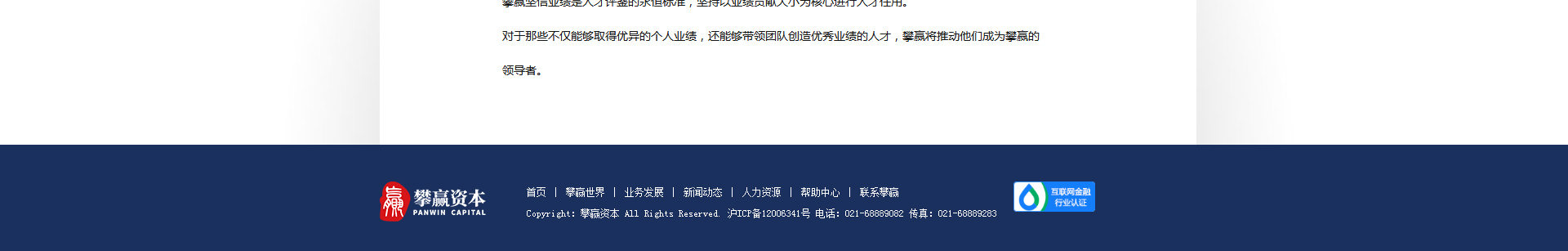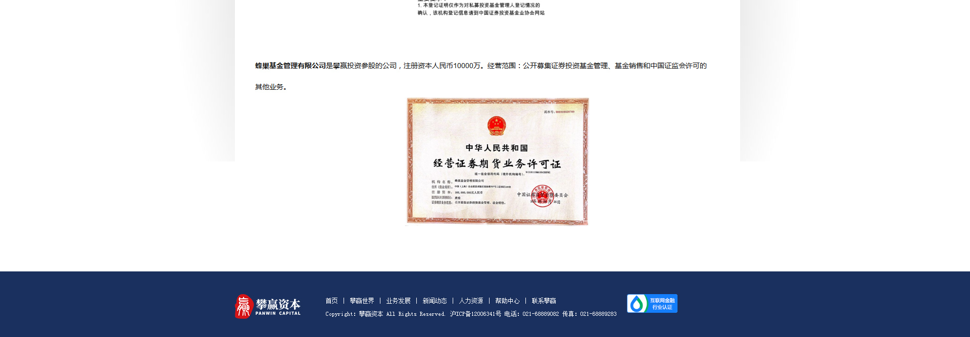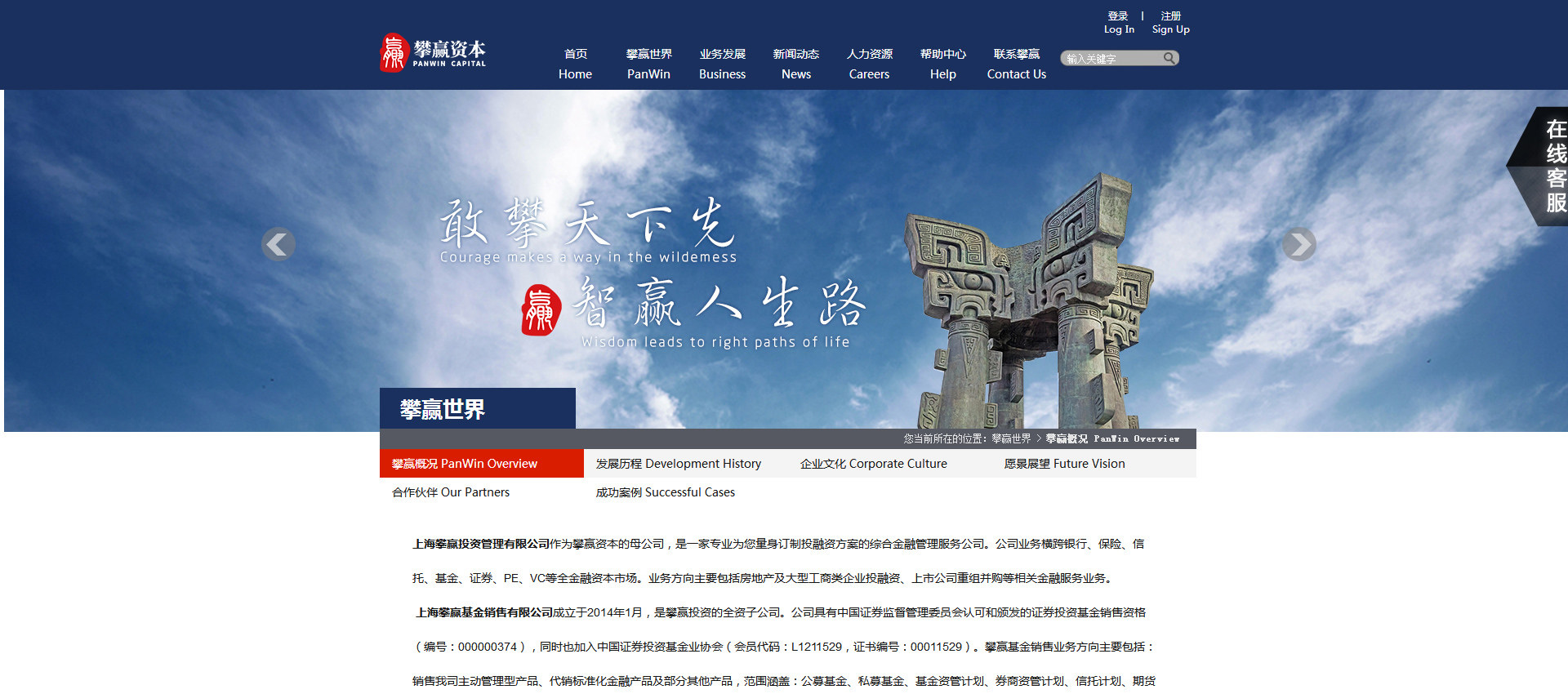 上海攀赢投资管理有限公司作为攀赢资本的母公司,是一家为您量身订制投融资方案的综合金融管理服务公司。公司业务横跨银行、保险、信托、基金、证券、PE、VC等全金融资本市场。业务方向主要包括房地产及大型工商类企业投融资、上市公司重组并购等相关金融服务业务。上海攀赢基金销售有限公司成立于2014年1月,是攀赢投资的全资子公司。公司具有证券监督管理委员会认可和颁发的证券投资基金销售资格。