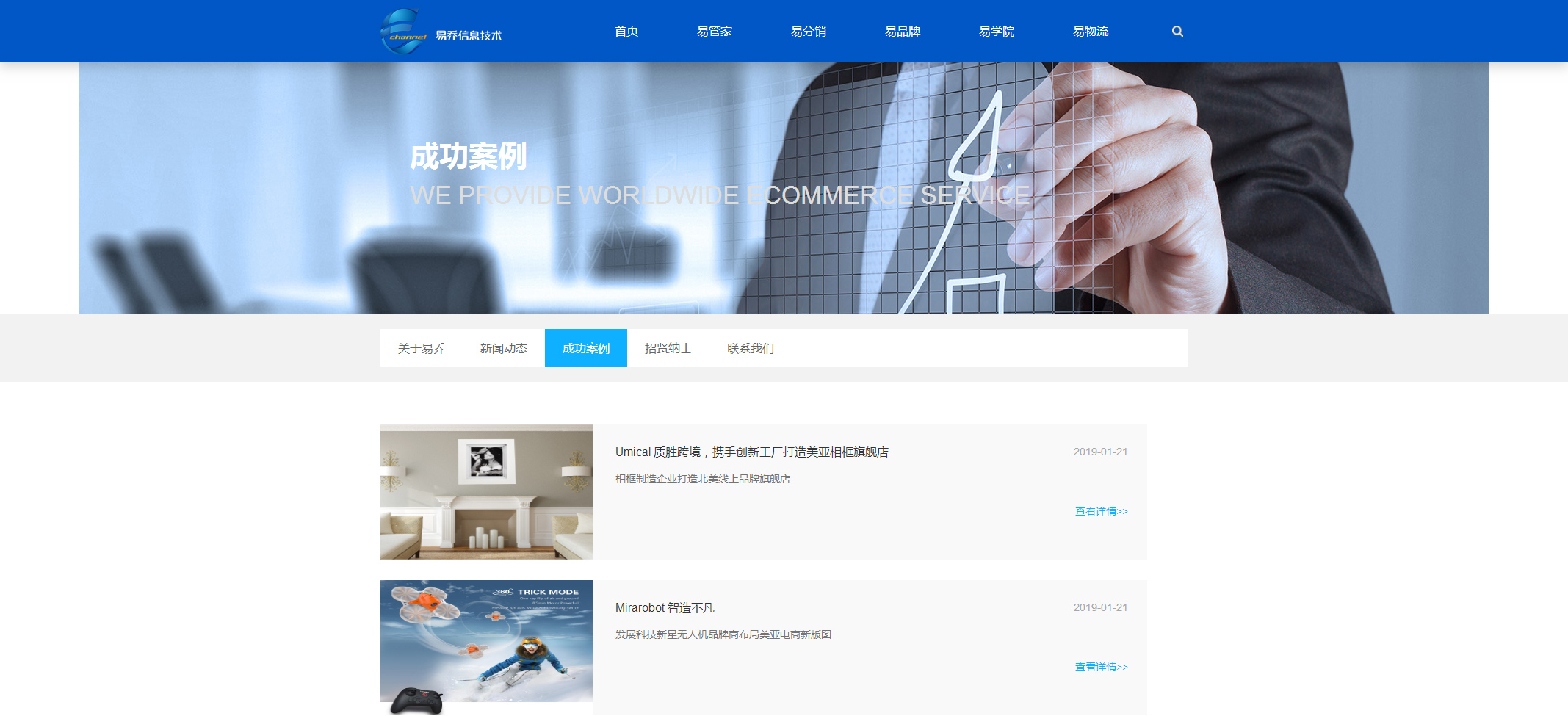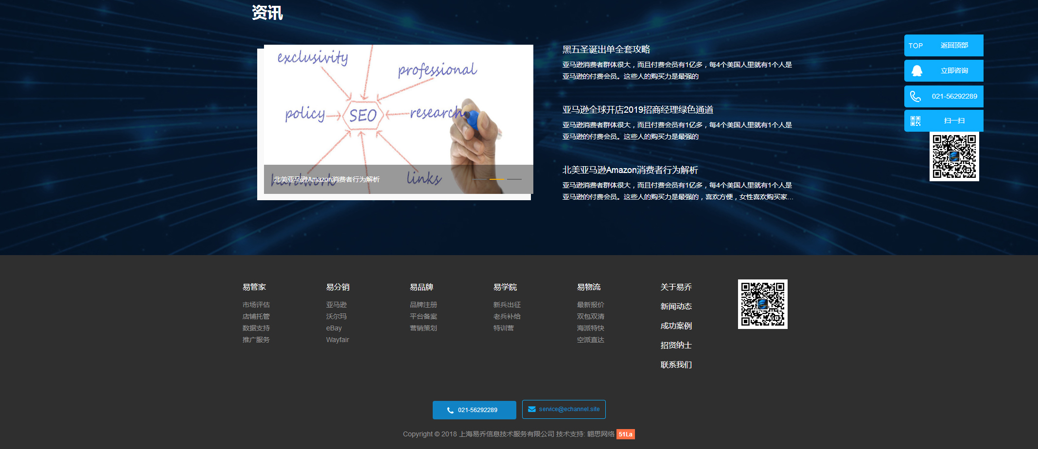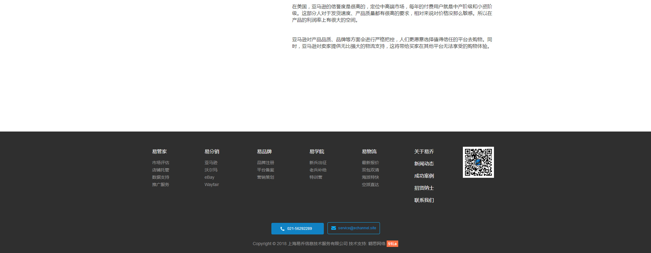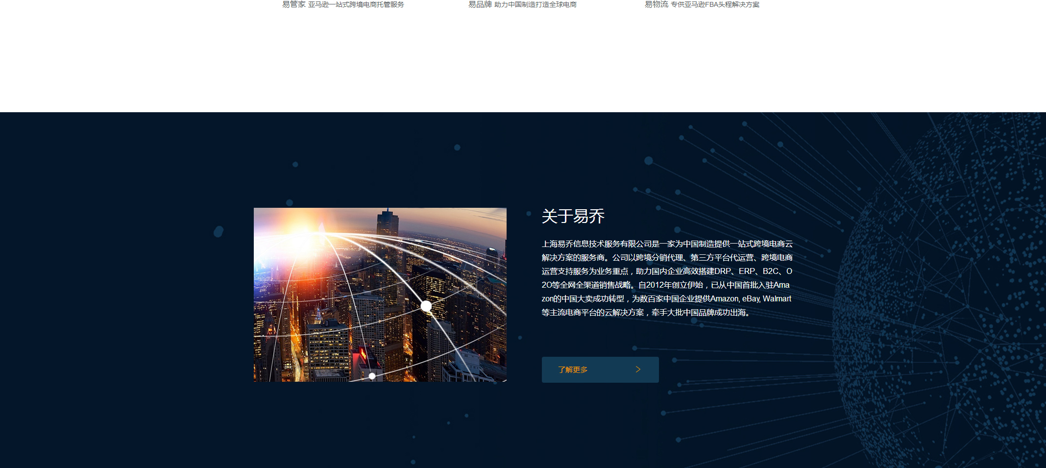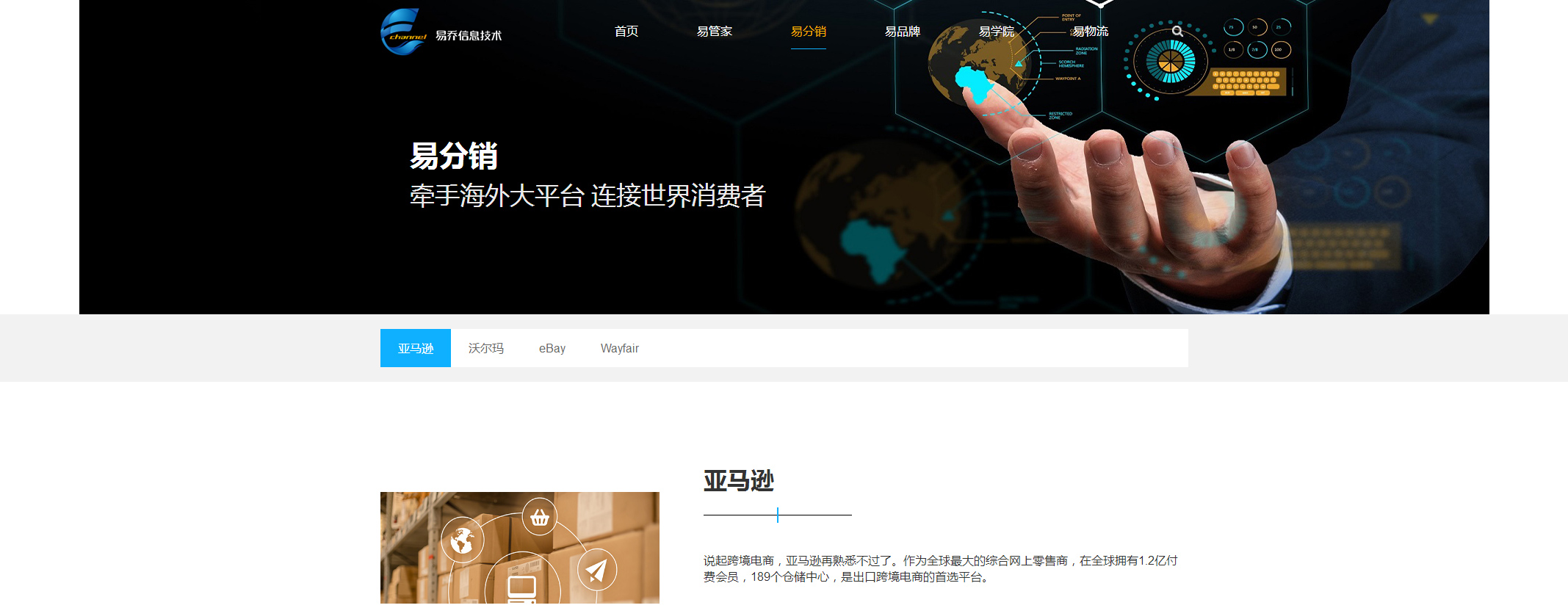上海易乔信息技术服务有限公司是一家为制造企业提供一站式跨境电商云服务解决方案的服务商。公司以跨境分销代理、第三方平台代运营、跨境电商运营支持服务为业务重点,助力国内企业搭建DRP、ERP、B2C、O2O等全渠道销售战略。今天的易乔,经过跨境电商领域的多年深耕,已从首批入驻Amazon的大卖成功转型,为数百家企业提供Amazon,eBay,Walmart等主流电商平台的云解决方案,牵手大批品牌成功出海。