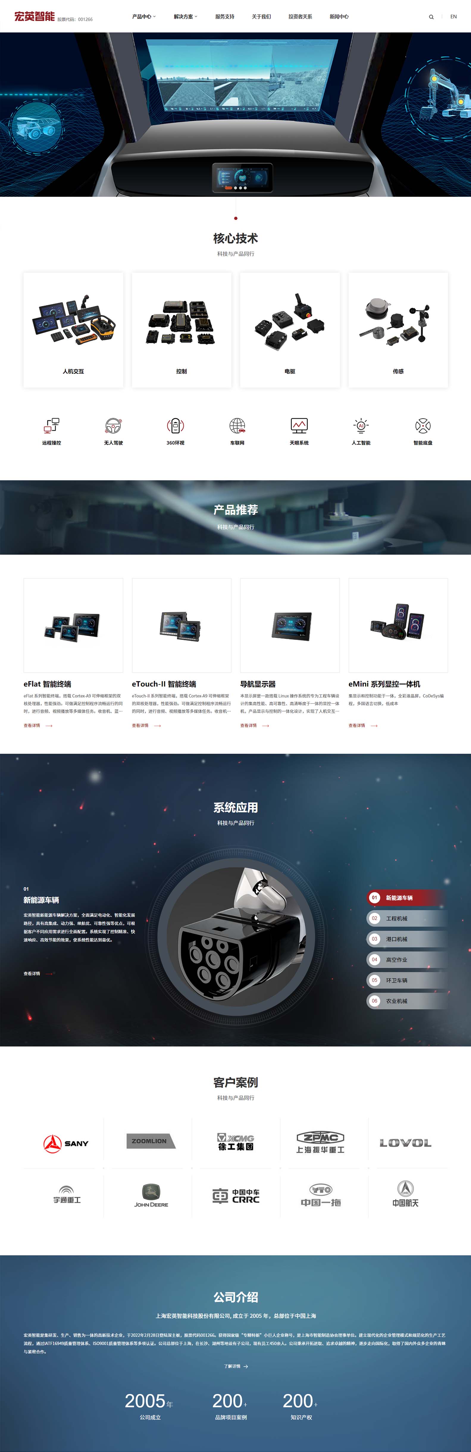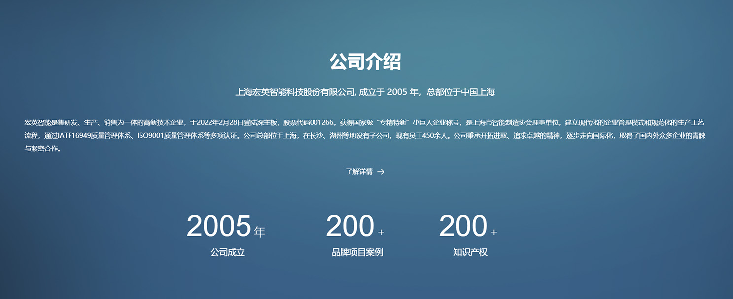 宏英智能是专注移动机械领域的集研发、生产、销售为一体的高新技术企业。公司成立至今,逐步建立了现代化的企业管理模式和规范化的生产工艺流程,已通过 ISO9001:2008 质量体系认证。公司总部位于上海,在长沙、沈阳设有分部,现有员工近200人。公司秉承开拓进取、追求卓越的精神。多种产品已获得各项专利及 CE 认证,并取得了国内外企业的青睐与紧密合作。